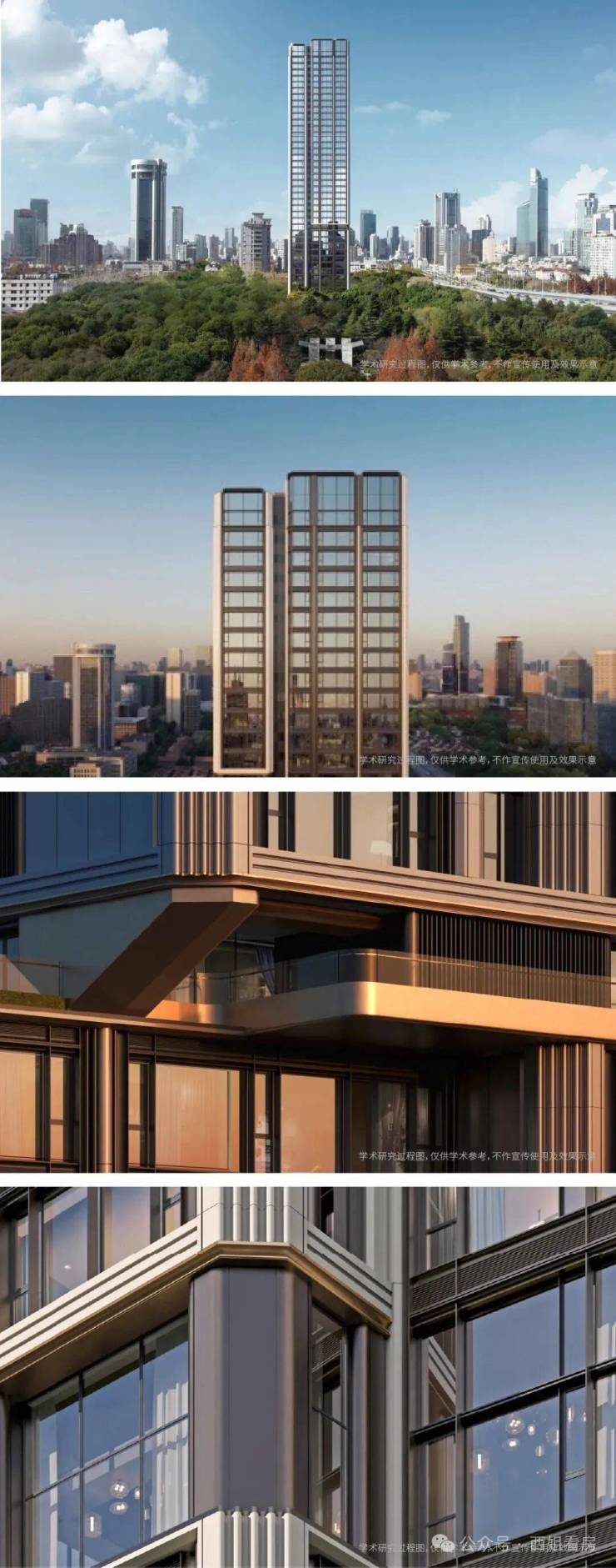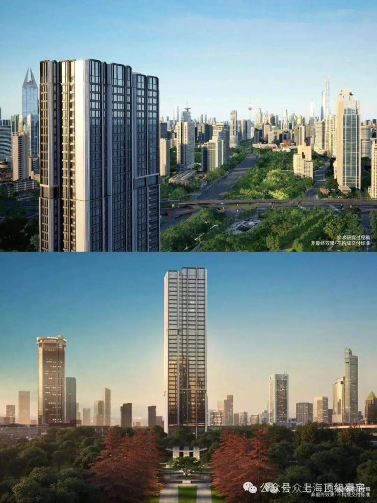 项目总占地面积约4.18万平方米,总建筑面积约16.8万平方米,规划有1栋43层150米超高层大平层(42套)与23栋石库门风貌别墅。超高层外立面采用超白Low-E玻璃幕墙搭配钛锌板,顶部设天际泳池,形成“水晶盒”般的现代美学;石库门别墅则复刻清水砖墙、雕花门楣等经典元素,内部配备智能家居系统,实现历史与现代的完美融合。鸟瞰实景图