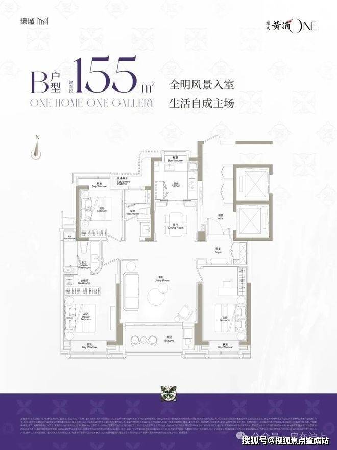 绿城·黄浦ONE规划了一幢住宅,两个户型依次排开,规整有序,边套是约193㎡4房2厅3卫,中间套是约155㎡3房2厅2卫户型,是纯粹改善大户型社区。