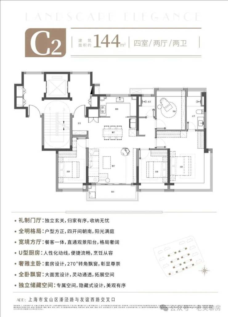 大尺度聚合方厅,为全家人打造陪伴高能的欢聚场;U型厨房,与一体化客餐厅、宽景阳台贯通,令家居动线更开阔流畅;奢雅主卧套房,270°转角飘窗视野,主人品位与格调尽情绽放;隐藏式独立储藏空间,可更轻松、有序收大件物品。