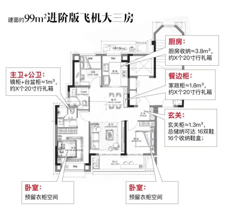 主力建面约99㎡3房产品,非常标准的南北通透飞机户型,整个室内几乎无走道,空间0浪费。