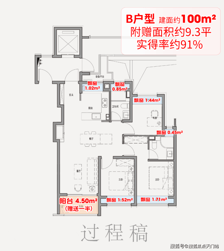 全系户型标配“全屋飘窗(全赠送)+大阳台(半赠送)”,经专业测算,百平米中间套实得率约91%,赠送面积达9.3㎡,相当于一间次卧。
