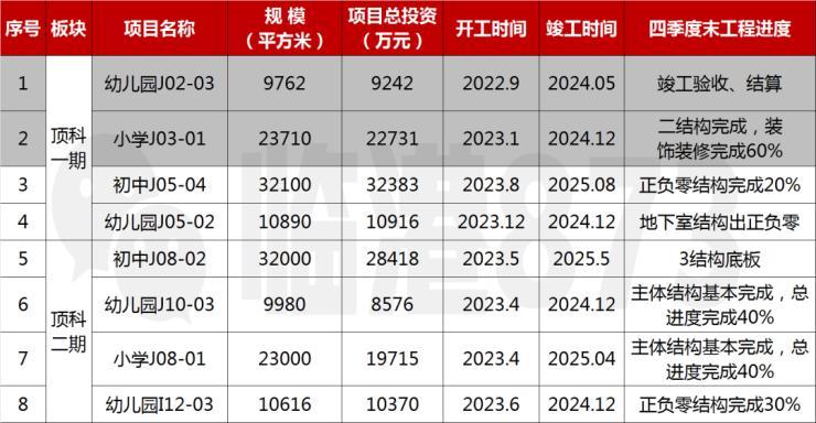 教育方面:顶科社区共规划10所基础教育学校。根据年初临港管委会发布的103片区年度建设计划,8所公建配套学校今年全面开工,24-25年陆续竣工。