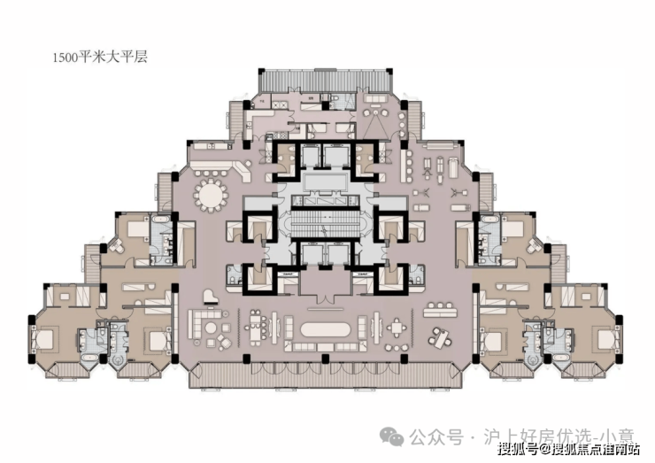 最豪气的还是这个整层一户建面约1500㎡的大平层户型。它南向面宽达60米,有14个阳台!
