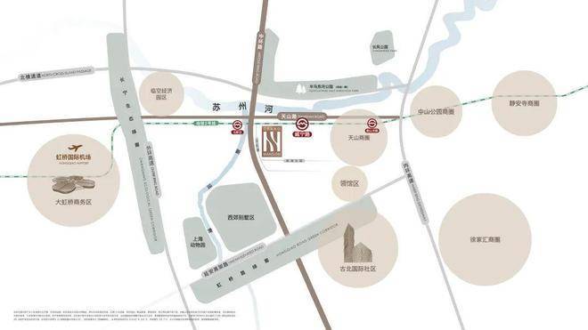 【地铁2号线】直线距离威宁路站约800m,北新泾站约300m,东向2站中山公园,4站静安寺,6站人广,9站陆家嘴,直抵浦东国际机场,西向3站虹桥2号航站楼,4站虹桥火车站,是上海名副其实的国际线。