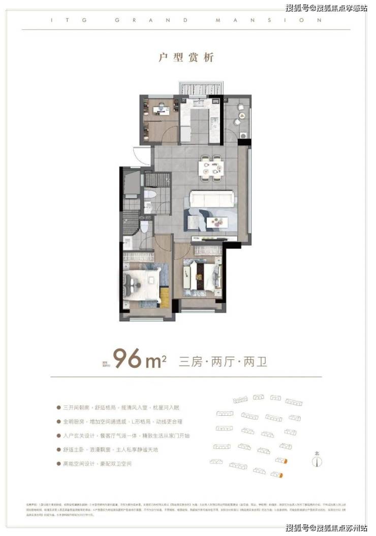 户型方面:约85-96㎡的全三房设计,每一款户型都是会传递出国贸的产品观。南北通透,布局考究,动静分离。