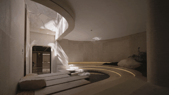 垂直空间上,虽然【越秀外滩樾】售楼处电话:400-885-5420✨✨项目用地比较紧张,但空间规划上还是在主入口处留出了一个庭院空间,作为整个项目透气的“眼”;再围绕这个庭院,生成了地下三层、层层递进的会所空间。