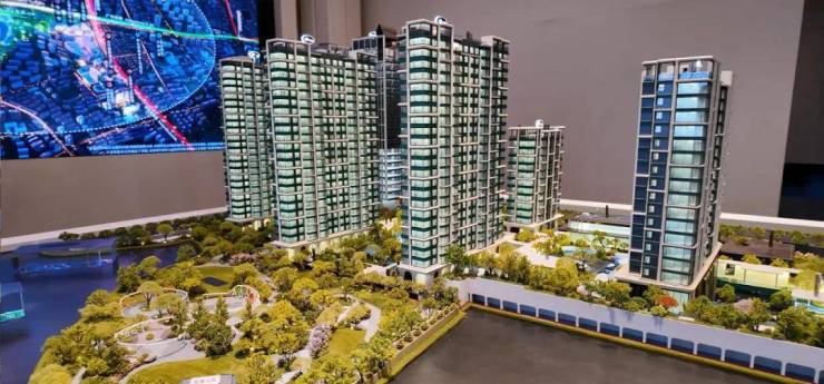 该方案亮点颇多,总计八幢高层和小高层设计,最南端的1#和2#楼均设置有私家泳池,而且还在19F采用了住宅楼当中较为少见的悬挑工艺,延伸出了一定的使用空间,个人预估这两幢会是配置大平层豪宅产品。