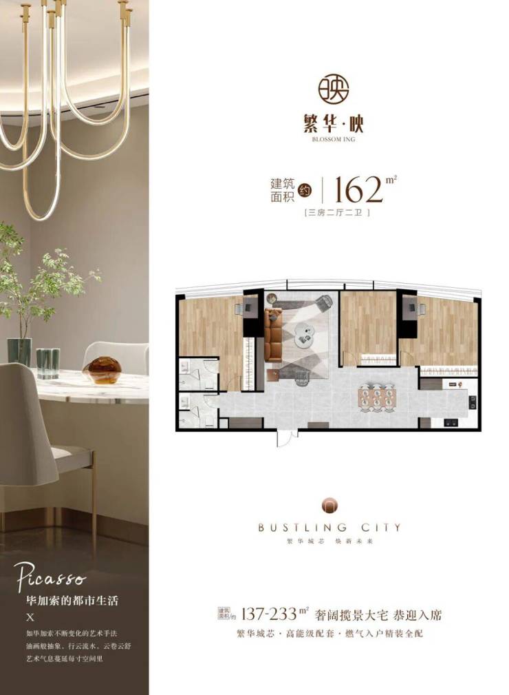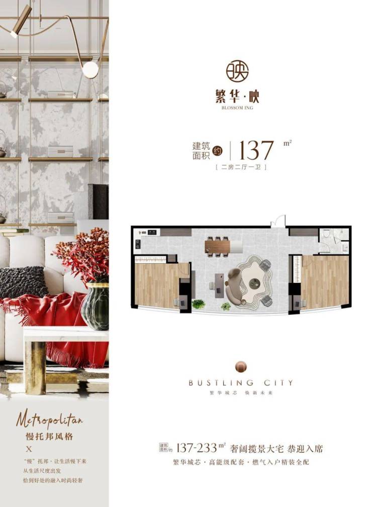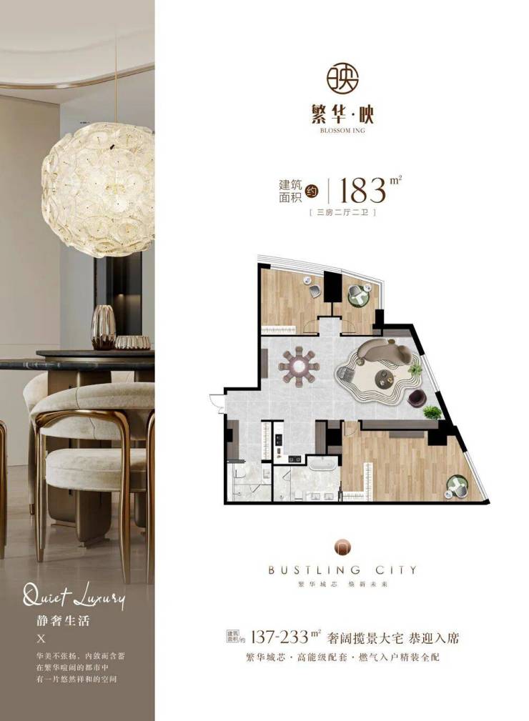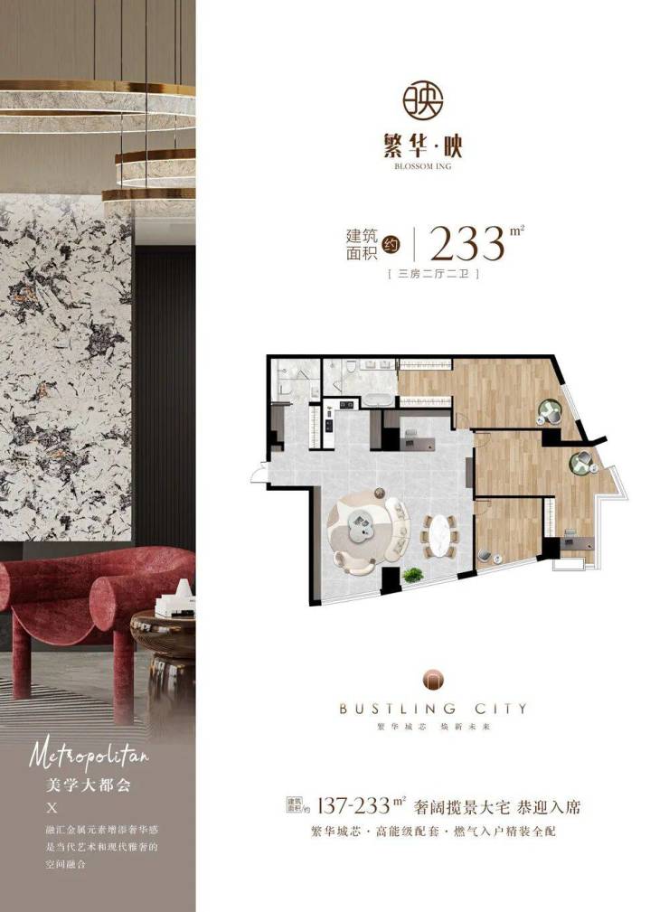 项目主推137-233㎡的两至四房大平层户型,层高约3.3米,得房率超75%,全屋精装交付,配备中央空调、地暖、新风系统等国际一线品牌家具。项目预计2025年12月31日前交付,总价800万元起,性价比突出,未来增值潜力巨大,是城市精英与投资客群的优选之地。