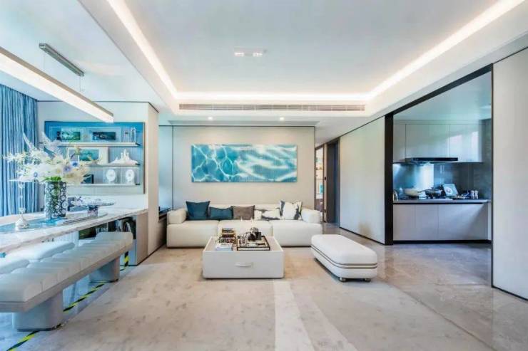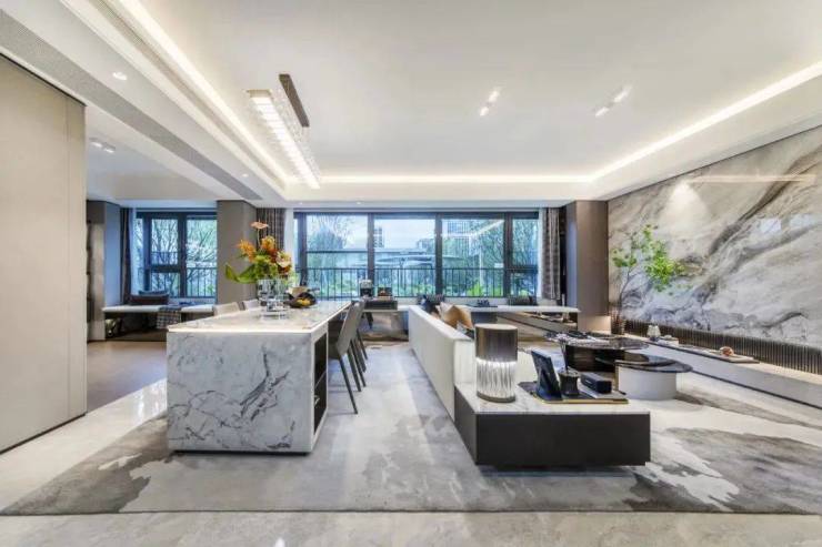 宽厅面宽约 5.5米,3.5开间面宽共约 11.5米,再加上约 8㎡的阳台,使得整个家庭的公共区域尺度感十足、功能也更加灵活多变。