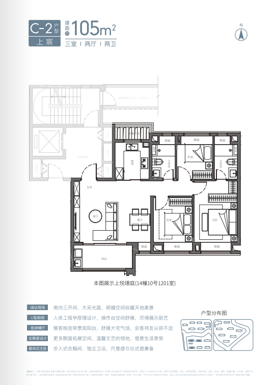 U型厨房、餐厅、客厅、阳台一线联通,南北通透。主卧套房、全卧飘窗、次卫干湿分离也都是标配。