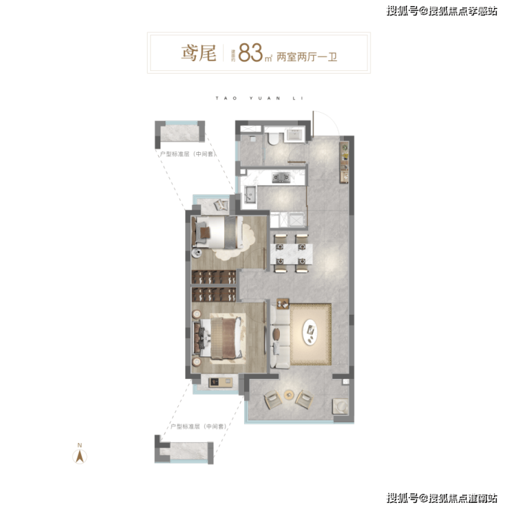 建面约83㎡两房户型▼