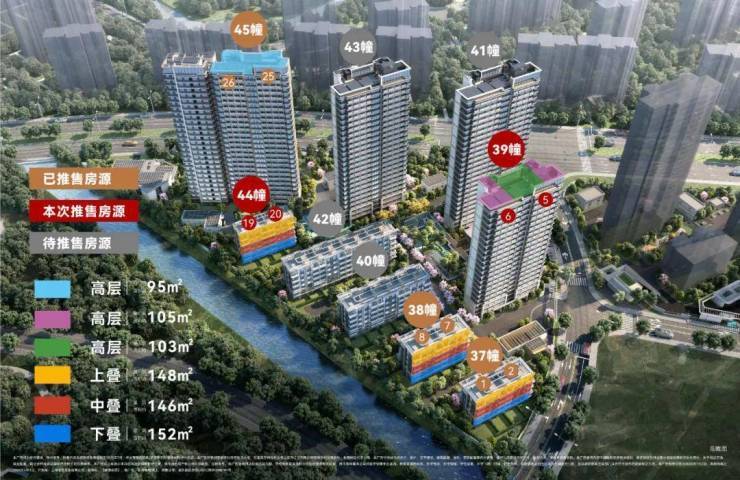 建筑面积约105㎡三房,进阶改善绝版“三阳台”户型,主力总价段约700万级,部分房源总价约650万级。