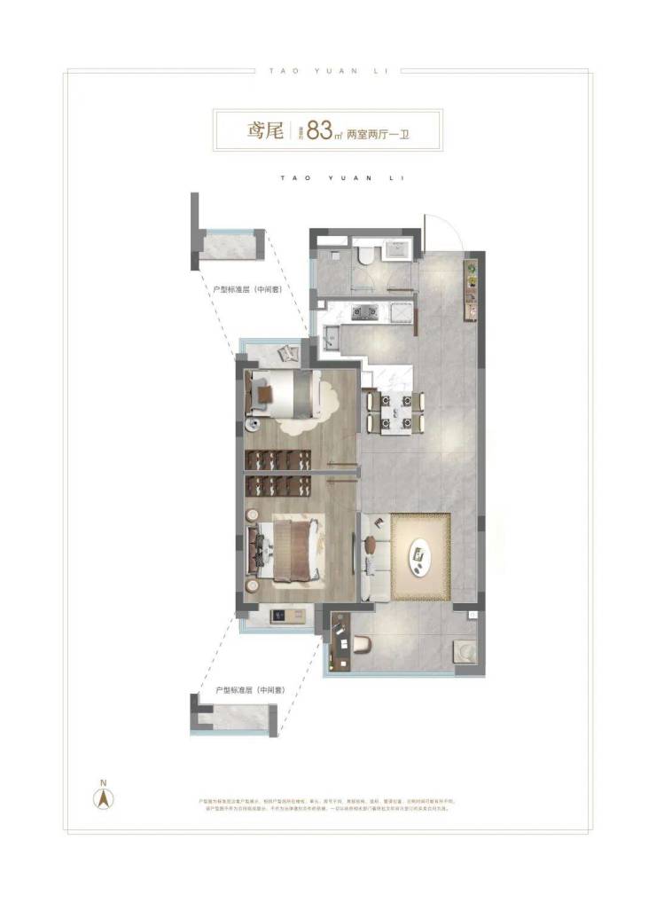 83㎡2房作为市场罕见的“入门级豪宅”,装修标准高达约4000元/㎡,客餐厅一体化设计搭配通阳台,空间利用率拉满,两卧均带飘窗;