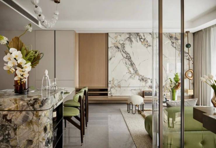 另外项目客厅背景墙不惜成本的采用岩板交付,质感更强颜值更高。
