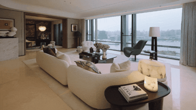 建面约239㎡边套,采用L型转角落地窗,打造了270°环幕瞰江视野,无论身处客厅、餐厅,都能以不同角度眺望黄浦江的波光粼粼。