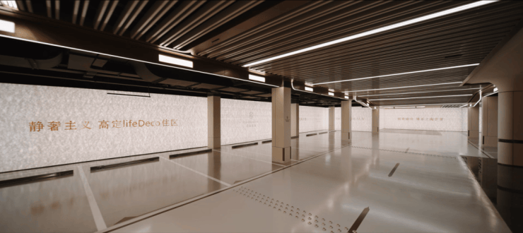 车库入口,以颇具艺术感空间的坡道尺度,配合雪山兰奢石墙面,追光式的灯带设计,营造层层递进的礼序感。