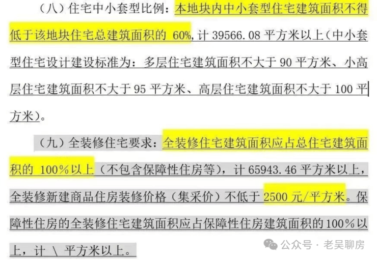 根据土地转让合同要求显示,项目规划住宅套数下限656套,全部装修交付,装标2500元/m²(集采价)