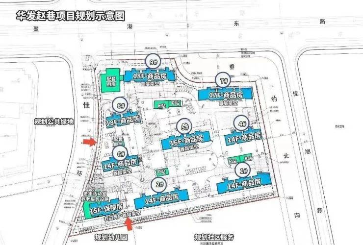 根据设计方案显示,项目拟建9幢14-18F住宅及配套设施,项目非人车分流,部分楼栋首层有架空,东面有河道经过,南面规划了一处幼儿园用地。
