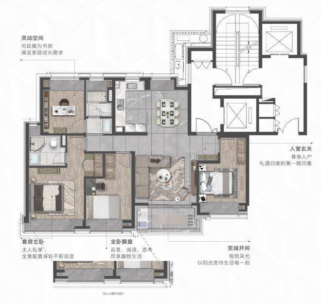 中环云悦府售楼中心电话:400-8787-740(温馨提示:本项目参观样板间采取预约制,为了不耽误您的行程,过来参观请提前来电进行预约看房或咨询项目详情)建面约135㎡灵动四房,以多一室的自由定义,让孩子的玩具、绘本、钢琴都能找到专属领地,同时保留完整的家庭社交场域;双南向次卧+北向多功能房,既满足老人同住的照护需求,也为未来的家庭结构变化预留调整空间;弹性书房可变儿童房进行过渡,形成双孩独立成长空间。