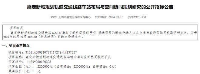 另外有一点值得重点一提:9月13日,上海政府采购网发布《嘉定新城规划轨道交通线路车站布局与空间协同规划研究的公开招标公告》。