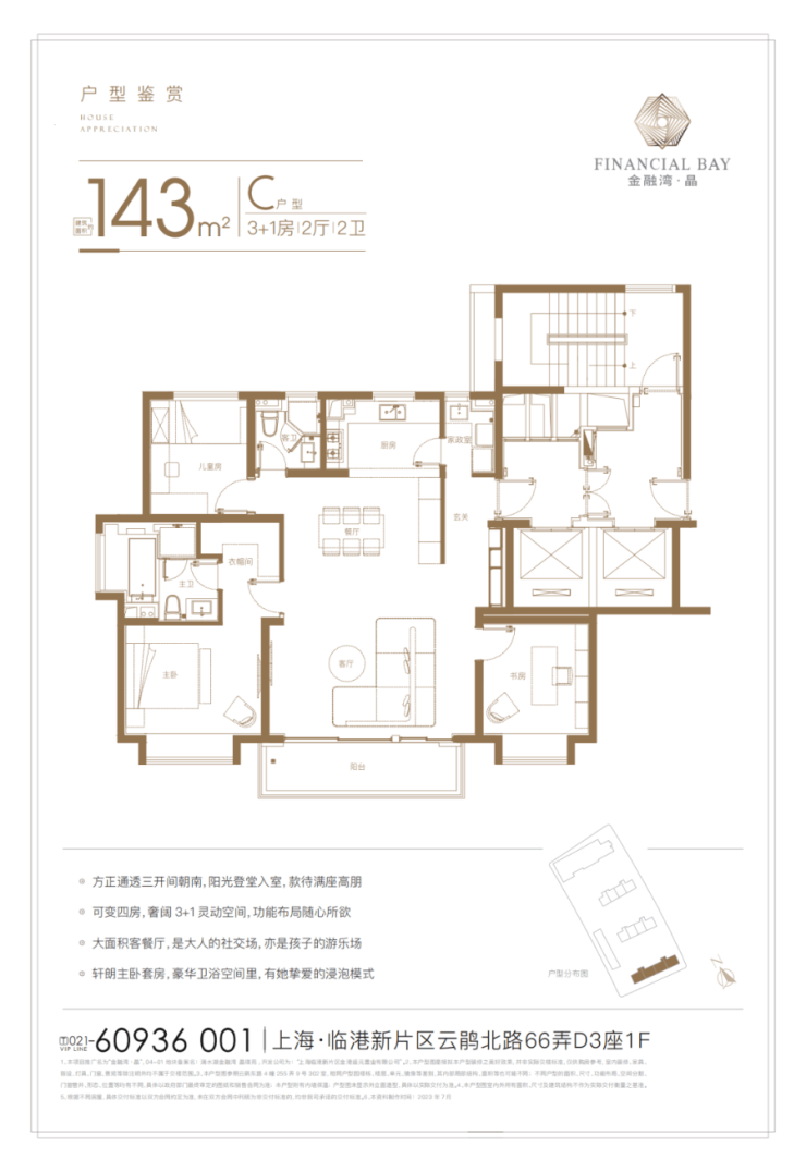 金融湾·晶直面百万方城市综合体,坐拥家门口的城市绿环、购物中心,以天幕之境匠心结晶,勾勒醉美滨湖天际线,以一环二园三水四景,营造绿岛都会湖居谧境,在湖海相逢的烫金之处,盛放澎湃人生。临港金融湾之上的国际金融住区,以one&only的环湖首排臻席,仅为少数人所争藏。