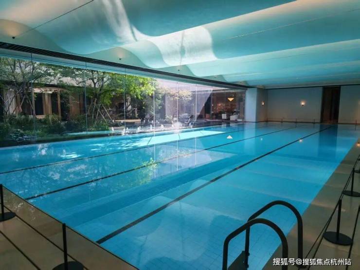 最后来看泳池。云邸玖章做了再升级。改为采用大尺度的落地玻璃拼接, 约2.4米宽巨幅玻璃, 且通过精致的玻璃交接细节处理增进室内外空间的融合,强调泳池的无界感,真正实现了无边泳池的效果、质的飞跃。