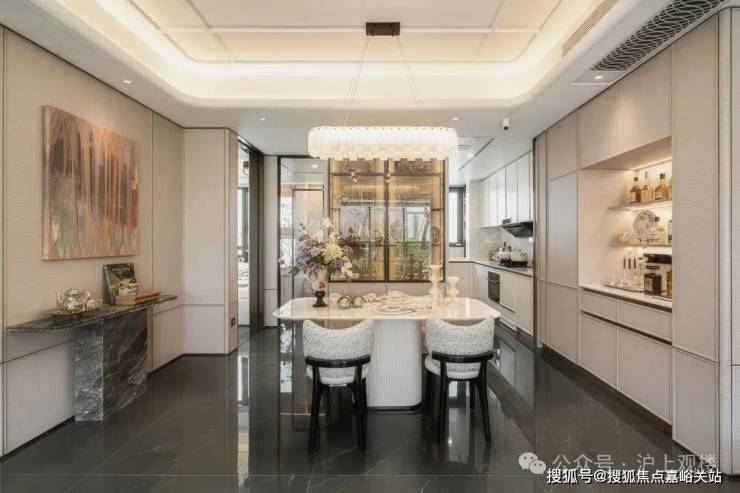 餐客厅岩板铺装:全屋餐客厅地面采用2.4米×1.2米超规格岩板交付,较市面豪宅最大约1.8米*0.9米的标准上, 在尺度上提升了约77.8%,大版面连纹设计减少拼接痕迹,呈现如整块天然石材般的视觉震撼。