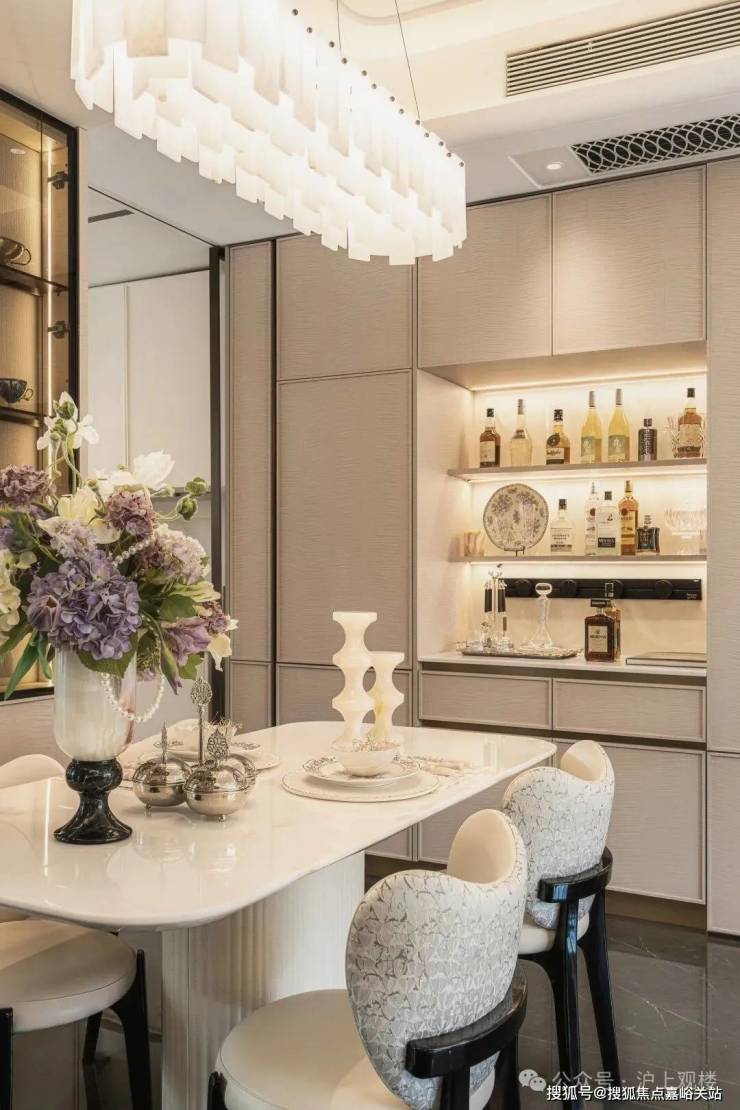 归家动线的打造更堪称艺术化表达: 极具仪式感的归家门头下,复杂肌理的铜板吊顶与宝格丽绿奢石门套交相辉映,辅以定制蚀刻纹样的精雕细琢,通过视觉的层次感与触觉的细腻质感,完成从喧嚣都市到私属领域的身份转换。