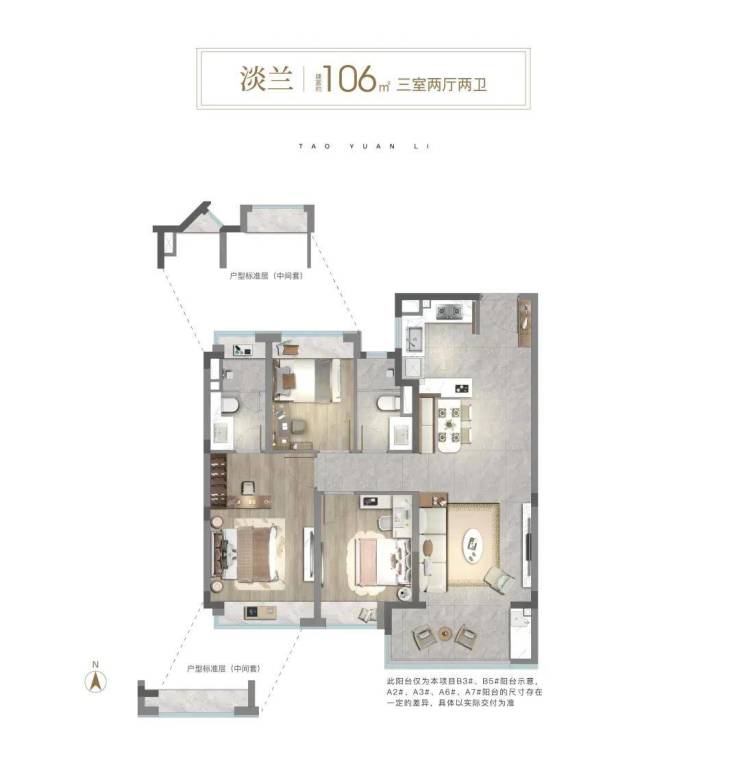106㎡3房则做到“真三房”,不是市面的“2+1”,而是每个房间都能做卧室;约3.45米客厅面宽、开放式可视厨房、南向大阳台,让家庭公共活动空间更显开阔。