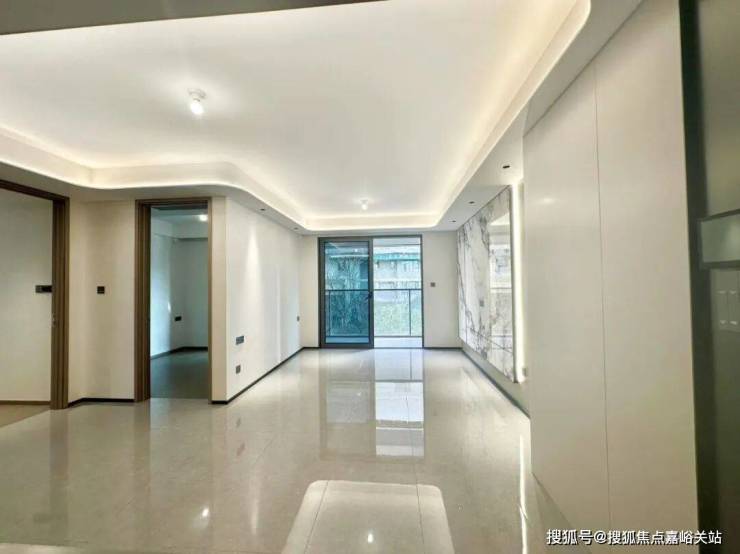 厨电配置方太的顶配系列:上方送风下方吸油烟的空调油烟机、灶蒸烤一体机;客厅配置内嵌式卡萨帝双拼冰箱;客厅大理石岩板电视背景墙面、弧形吊顶均为交付标准;