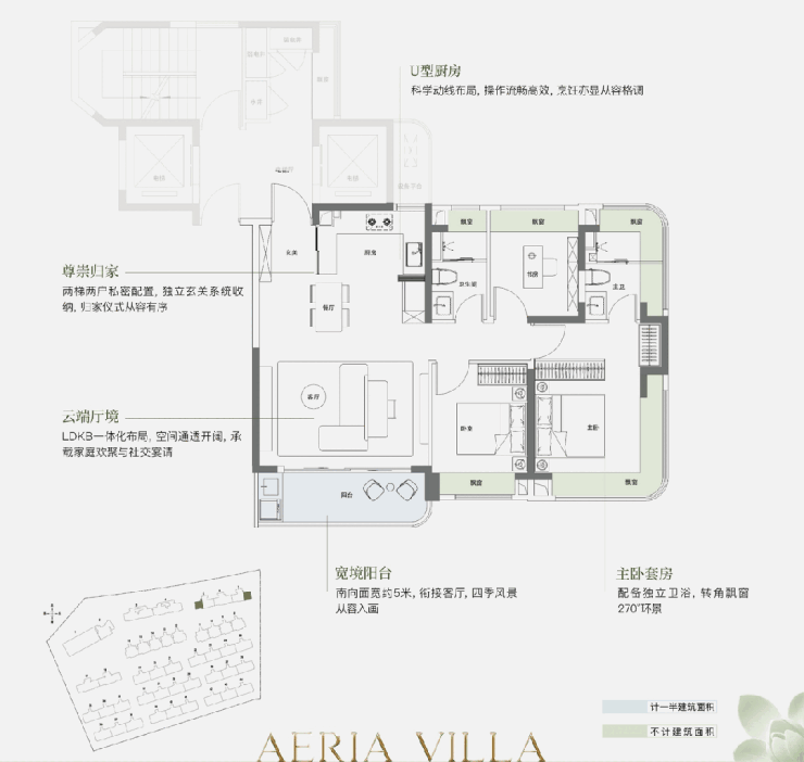 主卧更别出心裁地设计了两大270°转角飘窗,在同面积段产品中实属罕见,瞬间将睡眠区的景观层次与奢华感拉升到新的高度。