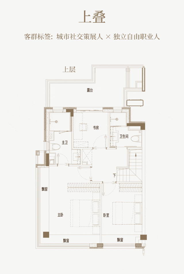 建筑面积约139㎡上叠边套户型,四层是会客区,五层是居住区,非常适合三代同堂居住。