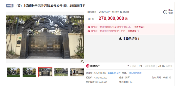 随后,上海市区又1栋百年老洋房将拍卖,起拍价1.5亿,起拍单价超过43万/㎡,土地面积848.75㎡。
