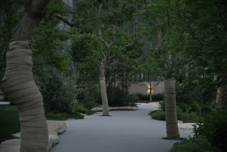 步入社区,首入眼帘的是约6米高水幕的下沉式山水庭院,与周围建筑融为一体,将自然与松弛感带给社区。