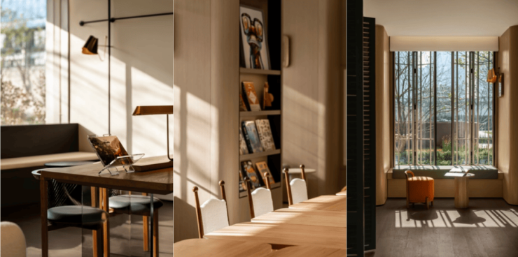 项目下沉式会所所有观景面都尽可能的使用落地玻璃窗,引自然与阳光入室,不管是跑步健身、瑜伽静心还是茶室书屋,都围绕着自然展开。