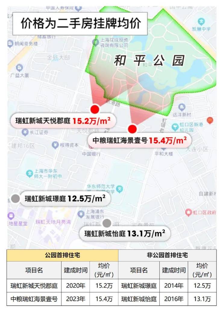 如和平公园周边,公园首排的住宅与其他小区的二手房价形成明显差异,且关注度、去化速度等明显更高一些。