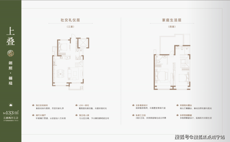 叠墅产品分为4F、6F层叠加, 主力产品建面约约122-133㎡上叠,132㎡大平层,131-145㎡下叠。
