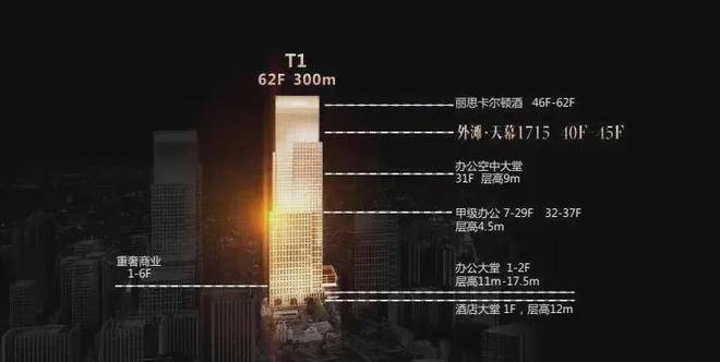 T1 -300米超高层塔楼上部46-62层为五星级酒店(丽思卡尔顿)、38,40-45层行政公馆,中部7-37层为甲级办公,底部为商业及大堂。