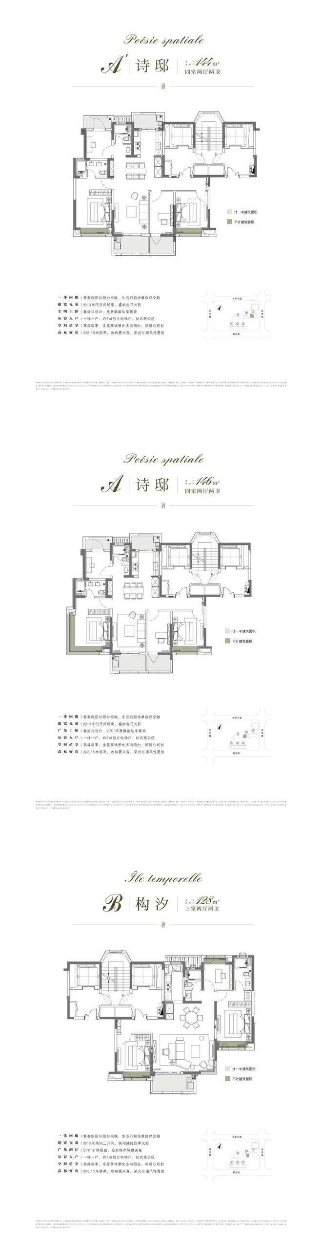 项目以116㎡户型为起步,纯粹改善型社区,所有户型都做到了约3.15米的层高,比普通住宅的层高更是多了35厘米左右,一梯一户的专属配置,预留的约7㎡独立入户区。建面约144㎡和146㎡的4房甚至做了4个阳台。