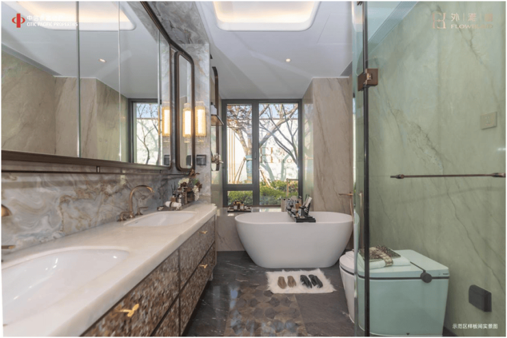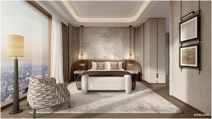 “全景舱”式套房主卧,为主人打造精细化的奢居功能体系。独立卫浴空间配置双人台盆、独立浴缸,衣帽间分设男女主人收纳系统,构建出酒店式的尊崇体验。