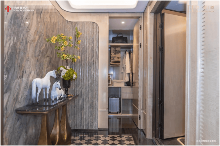 私密的本质,是空间对身份的认证。外滩道以“一梯一户”为起点,通过约6.5㎡独立电梯厅与独立玄关,构建双重空间缓冲:电梯厅承接社交往来,玄关收纳尘世琐碎。东向整面墙的收纳系统,让归家成为一场从喧嚣到宁静的身心过滤。