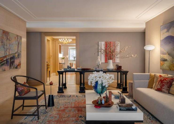 主要位置的多功能大长桌,可以做书桌,聚餐冷餐摆台,也可以做艺术品展示桌,让艺术与空间交融相生。同时,大长桌也起到了模糊走廊与客厅空间的作用,无形中放大空间的层次感,增添了空间的功能性。