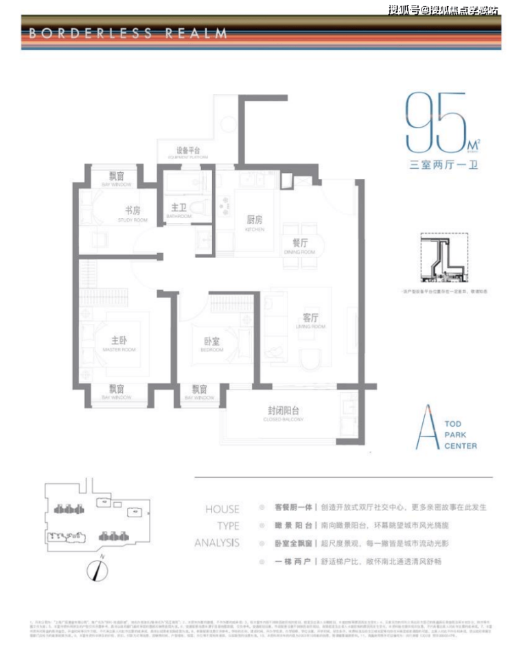 建面约95m²户型特点:开放式厨房,极度释放厨房与客厅的尺度与互动可能,无连廊设计,一梯两户极致梯户比,南北通透舒适感
