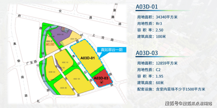 A03D-03地块:出让土地面积12859平方米,土地用途为商业,规划容积率1.95,计容建筑面积25075平方米。