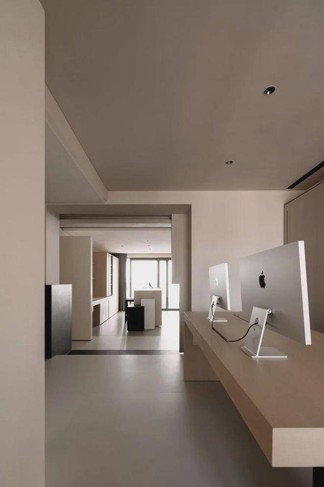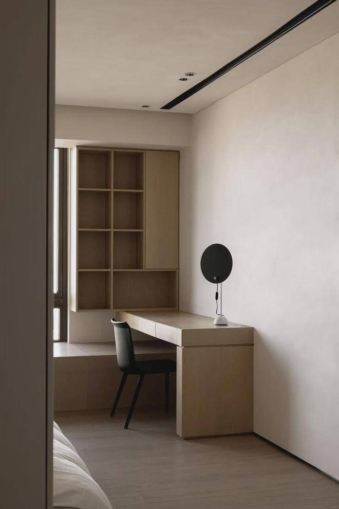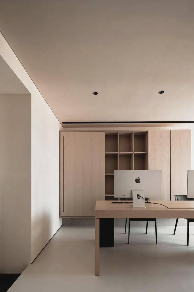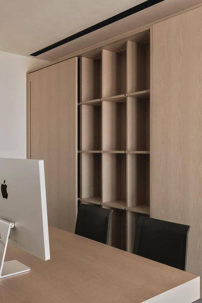 自然原木色系让人不禁沉浸下来,轻灵纯粹的空间气韵直击心灵,在这里思考、激发、输出。自由移动的隐形门,关上,书房是一个灵感生产容器;打开,再次回归纯粹的生活里。