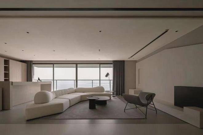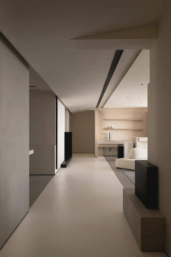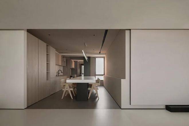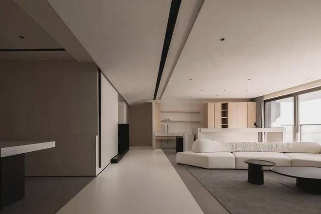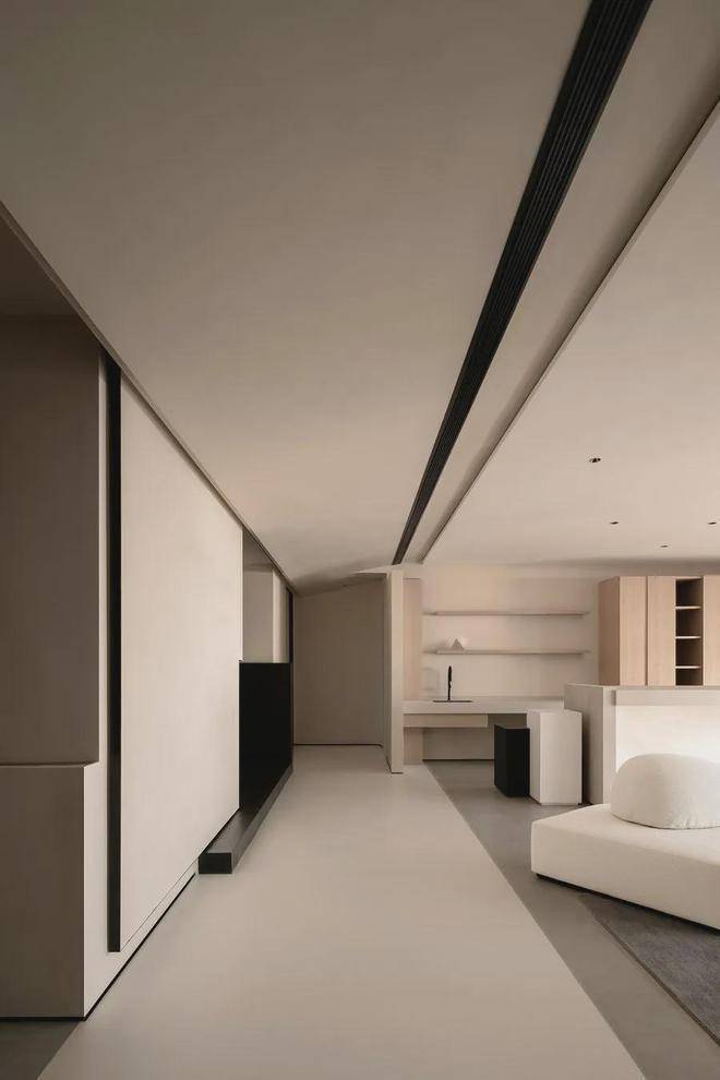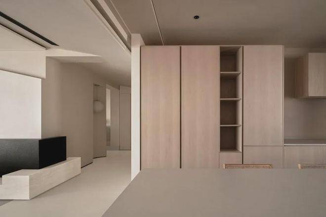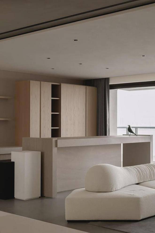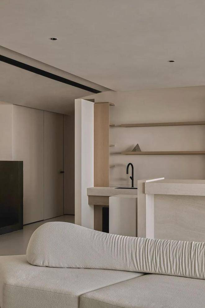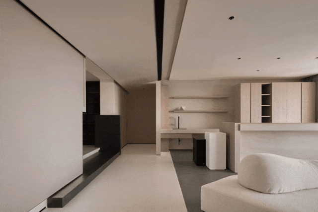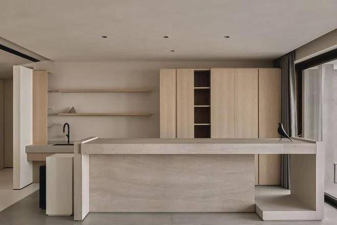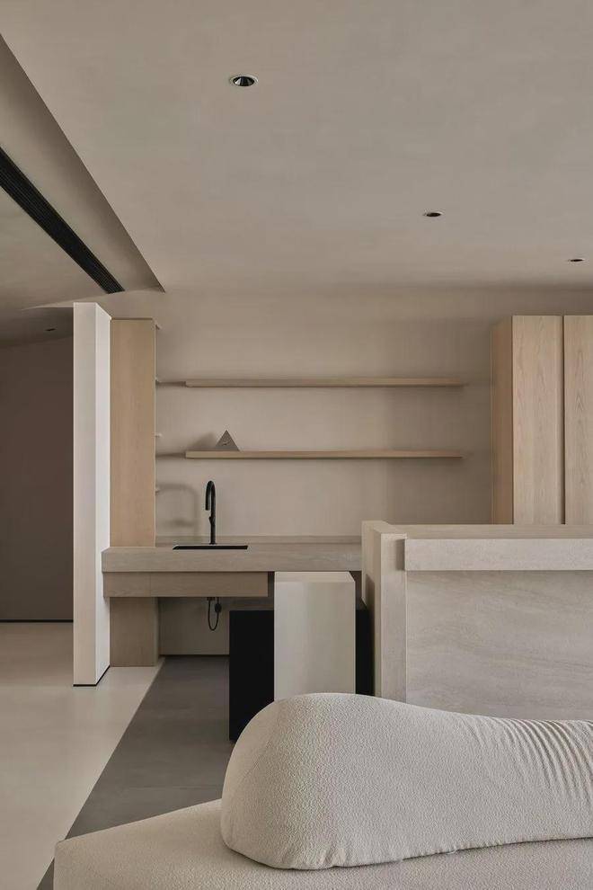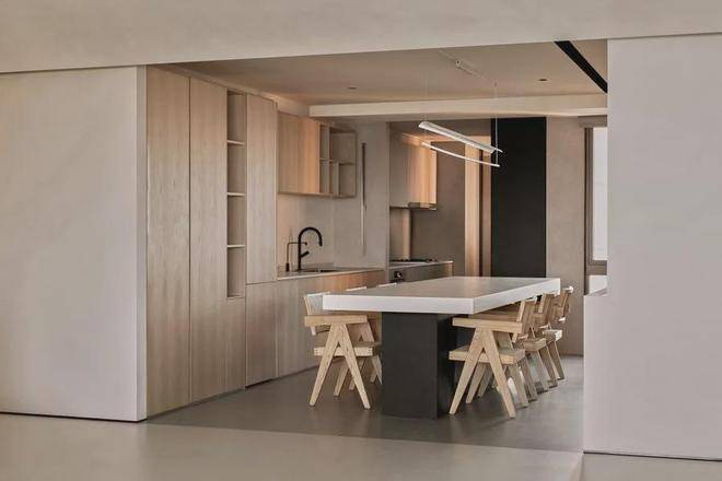 遵循现代极简的设计语言:「自由平面」与「流动空间」,简约的立面与精妙的材质,如岩板、原木色柜体与微水泥,形体的简洁与纯粹从这纵横交错的垂直水平立面被构建出来。每一空间都有自己的生命系统,容纳着我们的呼吸、感知,生活的展开与收敛。