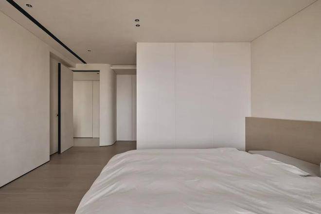主卧是最能呈现出主人生活哲学的空间。除了必要的衣帽间、床、梳妆台柜,卧室尽可能做减法,摒弃所有繁复冗杂的摆设。每当回到卧室,所有思绪回归自我和返璞归真。