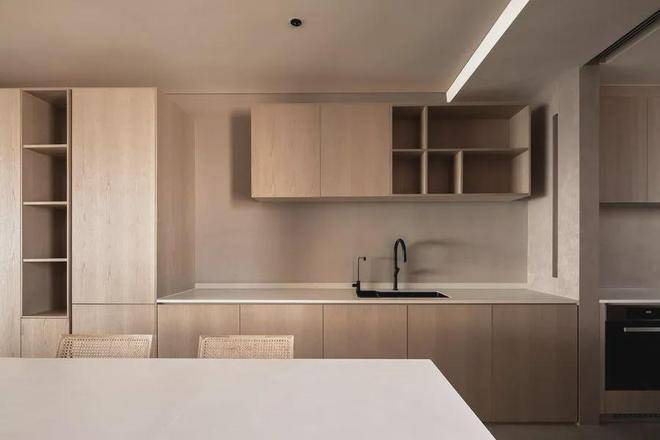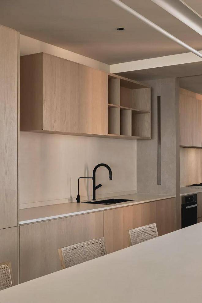 西厨设计上相对克制,将烟火气模糊淡化。餐厨空间呈不规则条形结构,整面柜体利于将所有视线内物品收纳于此,始终保持整洁清爽的氛围。木质和岩板元素之间的碰撞,呈现出一干净空间的氛围。家,围坐而食,珍馐百味,共享此刻。