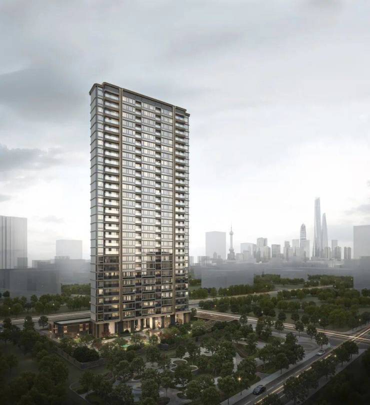 建筑外形上,采用海派现代风格,蓝灰色玻璃、仿铜色铝板、深色石材搭配,将绿城产品的高辨识度再次呈现。