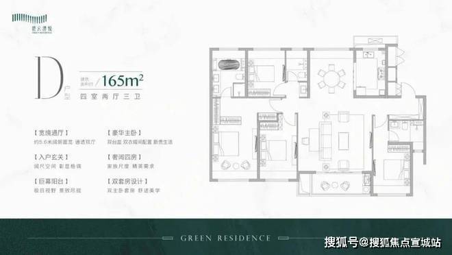 建面约 165㎡四房两厅三卫:得房率约 83%,总价约 850-924 万,层高 3.15 米,270° 转角阳台,主卧双台盆 + 浴缸。